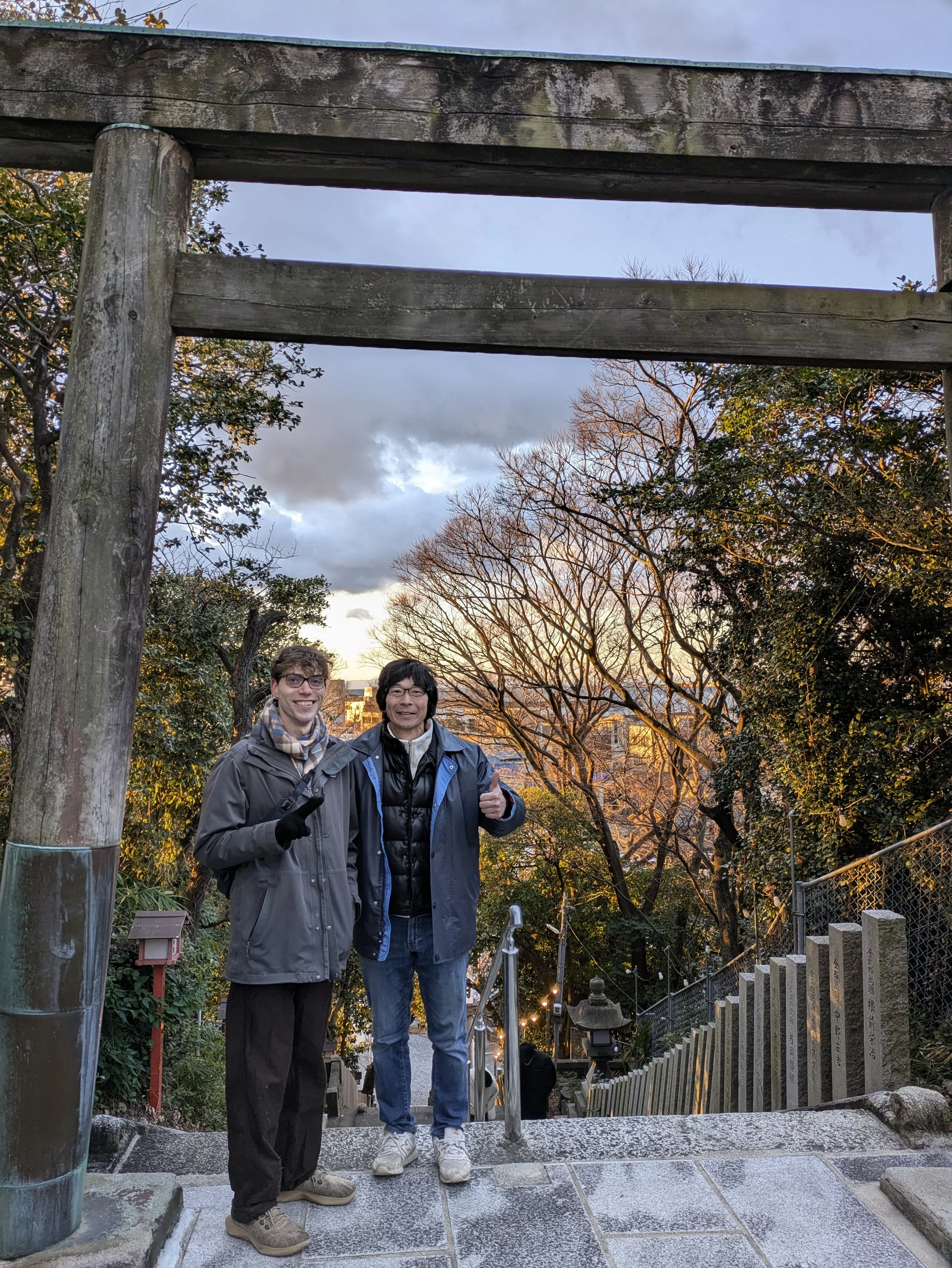 January 1st, 2025: Takayuki Yagi and Alex (right to left) sleepily enjoying the first sunrise of the year from the local shrine in Tokoname. Yagi-san is a Tokoname potter, dear friend of mine, and an incredibly generous person who invited me and Alex to be a part of his New Year’s festivities– a holiday that is usually reserved for spending time with family.