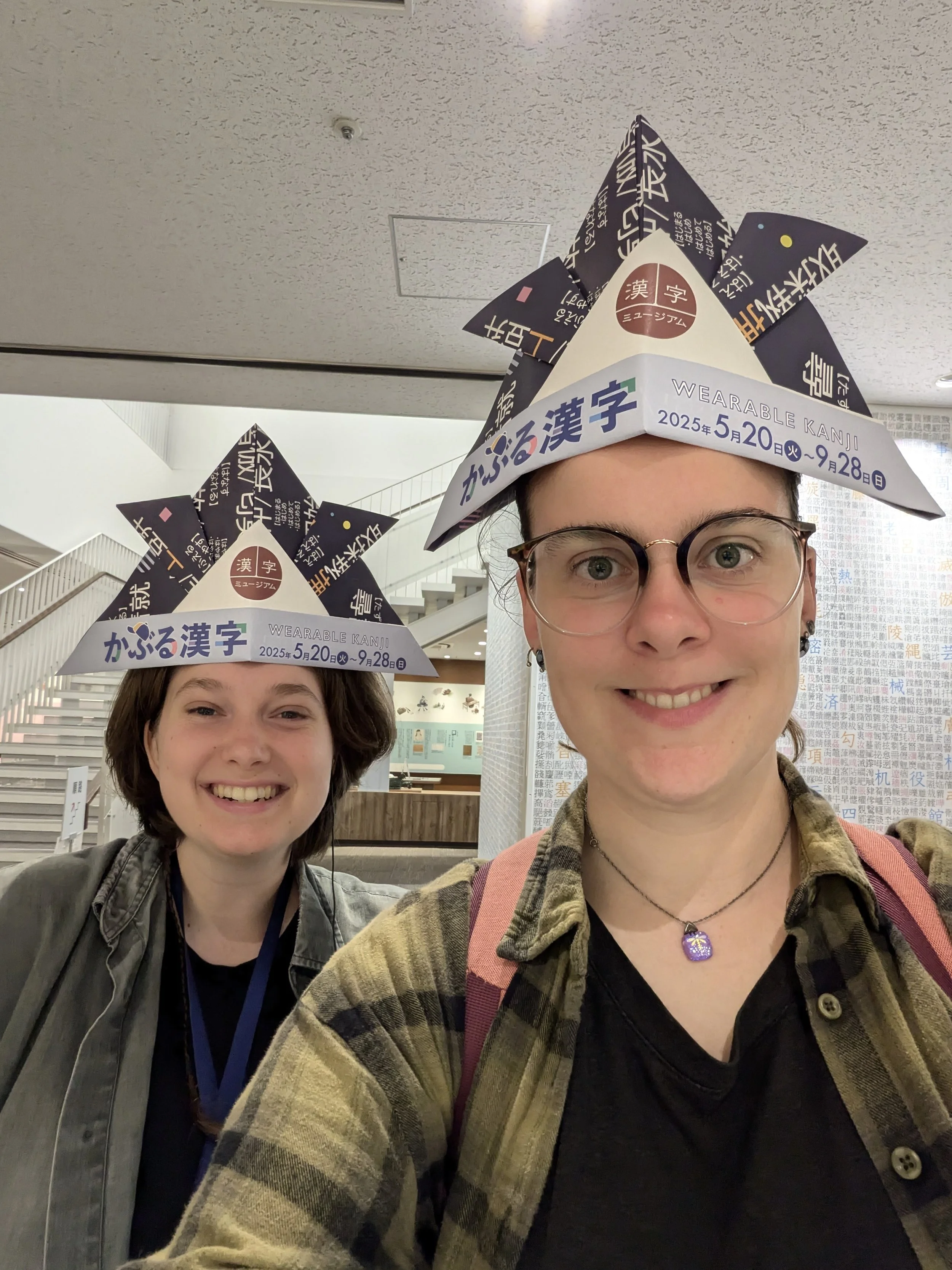 June 22nd, 2025: My high school roommate and best friend Aryn Rivers and I wear hats made out of kanji that I have yet to learn how to read at the Kanji Museum and Library in Kyoto.