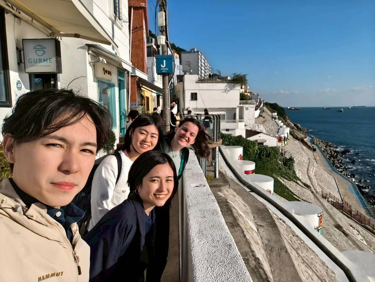 November 2nd, 2025: (From front to back) Hiroshi Tanaka, Yuka Kobayashi, Momoe Shigemitsu, and I take in golden hour on the Busan coast at the Huinnyeoul Culture Village. Eager to see as much of Busan as we could, we traveled across the city during a day out on the town.