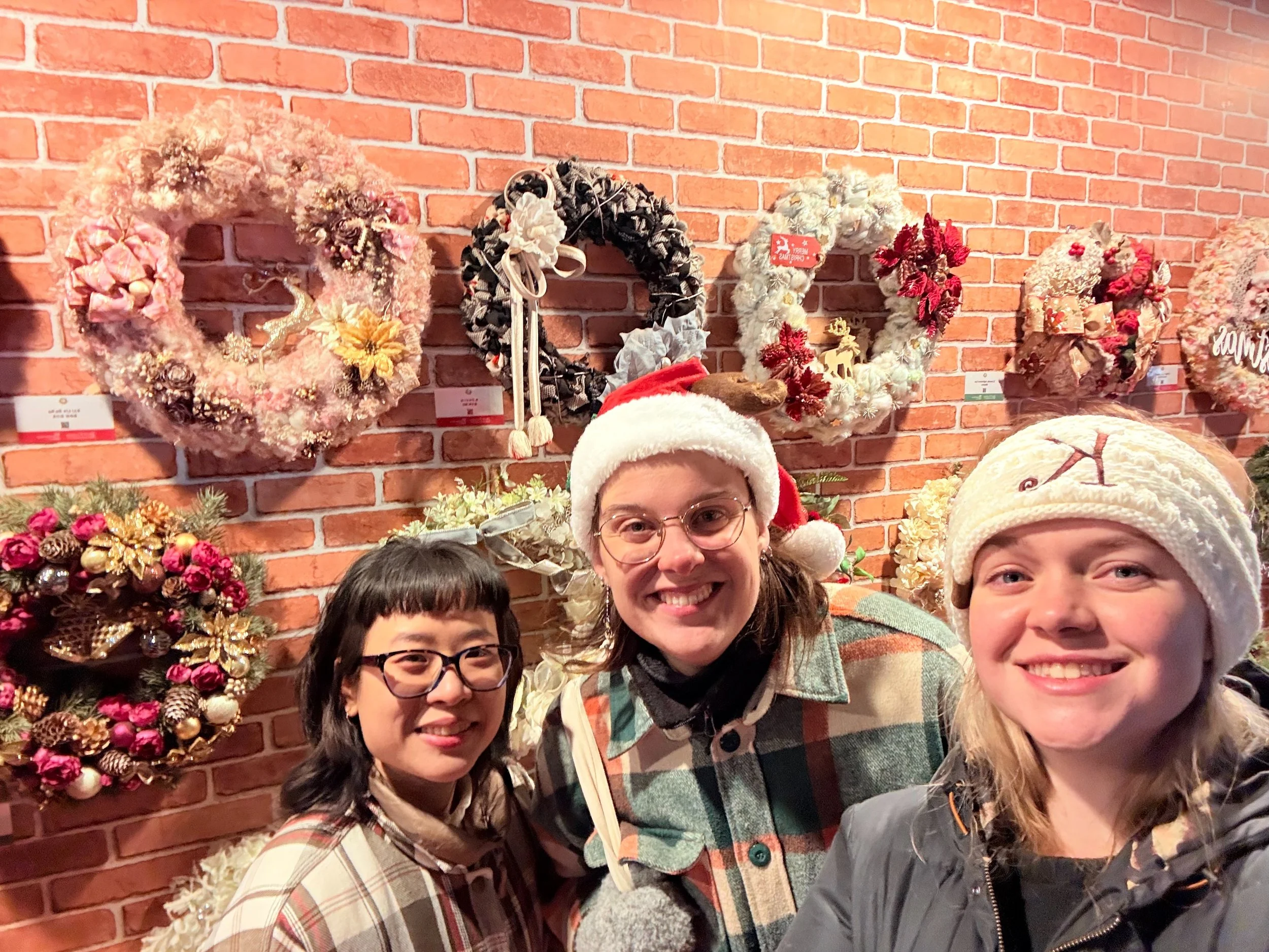 December 12th, 2025: Kori Kelley (right), a friend of mine from my time studying abroad with Associated Kyoto Program, met up with me and co-fellow Yuhki Ueda (left) to go to the Tokyo Christmas Market. Here we are admiring the wreaths.