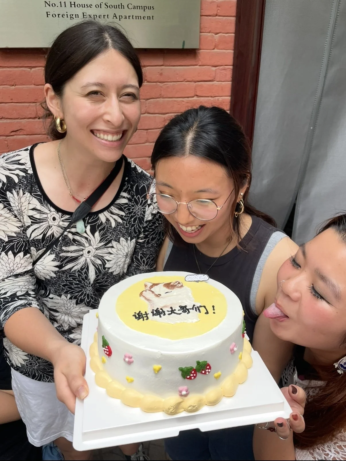 Dina, Elaine, and Tiffany with their 谢谢大哥 (xie4 xie4 da4 ge1, thank you older brother) cake