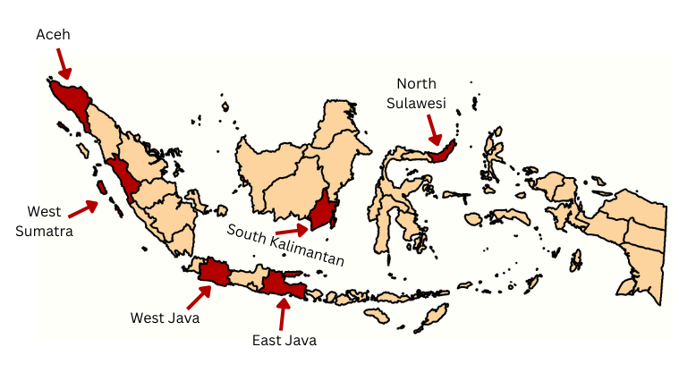 Map of the Indonesian provinces. The labeled provinces are represented in Indomie’s Kuliner Indonesia collection.