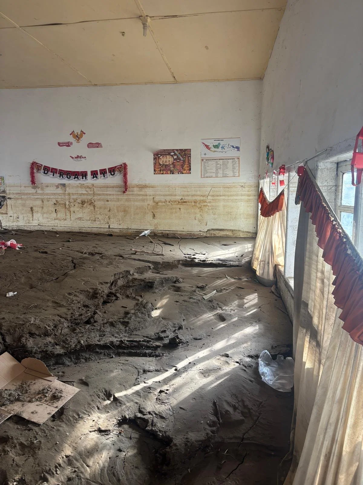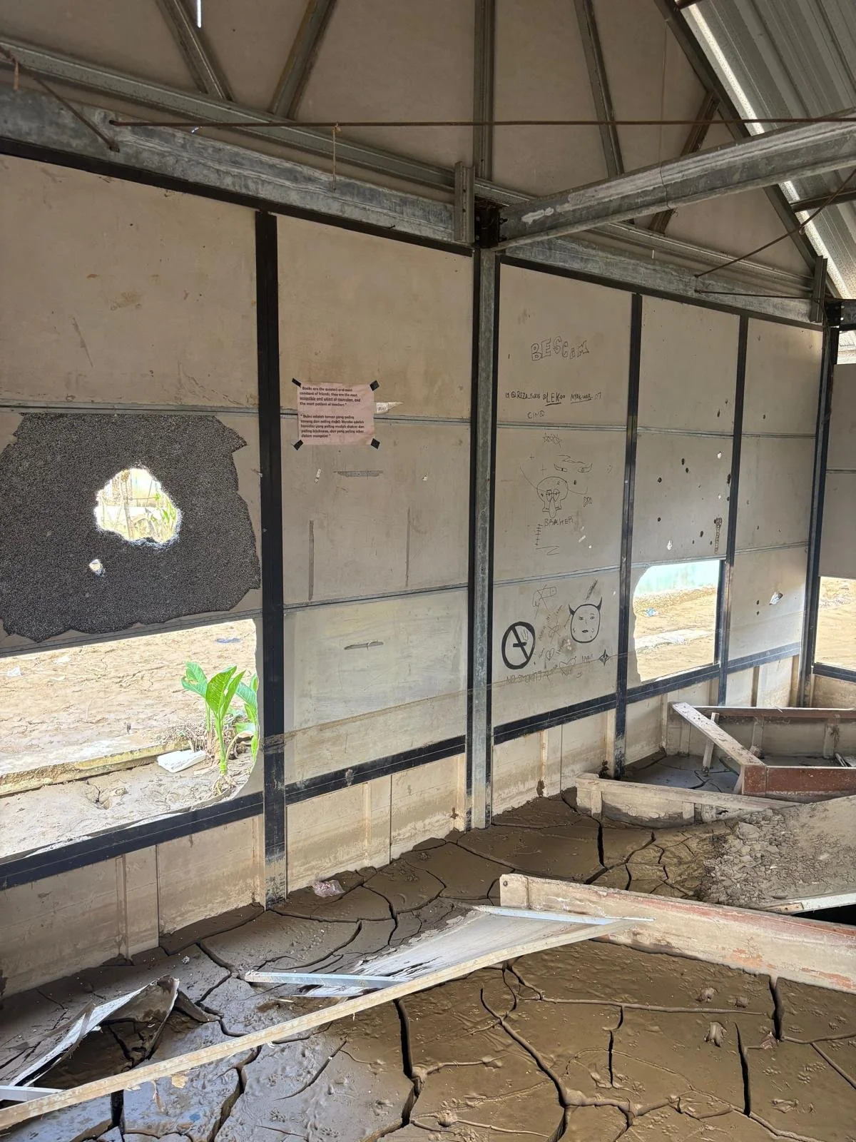 As the NGO workers drove us deeper into the affected area, the debris along the roadside grew to unimaginable heights. At last we stopped and walked up this mountain of branches, bricks and lumber, until we reached another school. It had once been a single complex but was now completely torn in half by a newly formed river. Stepping inside the classrooms, student-made decorations still dangled from the ceiling and pictures of Acehnese heroes lined the walls. On the white board was still the faint outline of the day's lesson, or at least what was still visible above the dried block of mud that buried the classroom nearly six feet deep. Wordlessly, we walked back and got in the car to go home.